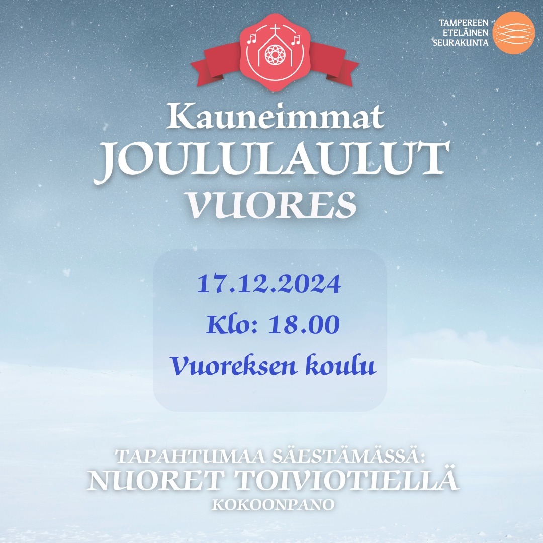 Vuoreksen Kauneimmat Joululaulut -tilaisuus järjestetään Vuoreksen koululla 17.12.2024 klo 18.00. Tilaisuutta on säestämässä Nuoret toiviotiellä -kokoonpano.